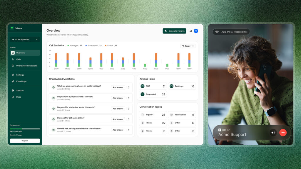Julkaisemme nyt uuden version AI-reseptionistista, jossa keskitytään täysin itsepalveluun. Voit luoda AI-reseptionistin suoraan Telavox-sovelluksessa, valita kielen, äänensävyn ja äänen, ladata materiaalia, kuten usein kysyttyjä kysymyksiä ja hinnastoja, sekä seurata kaikkea selkeällä hallintapaneelilla. Tilastojen ja oivallusten avulla voit jatkuvasti hioa vastauksia ja parantaa sekä asiakkaiden että työntekijöiden kokemusta.